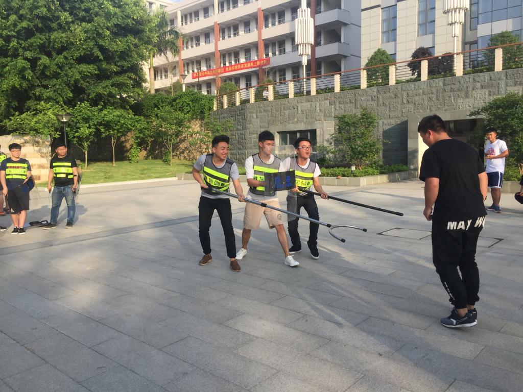 此次演练活动主要由盾棍相结合的人墙抵御战术演练及预设场景演练两大部分组成。首先,通过10名校安保人员进行了人墙抵御战术、盾棍实战对抗及应对突发事件时整体阵型攻防变化的演练示范,战术明确、气势高昂,充分展示了我校安保队伍服从命令、听从指挥的优良风气。第二部分,由31名学生进行战术学习及盾棍操作演练,并通过3对1的模式展开了预设场景演练,对手持管制刀具的“歹徒”,同学们临危不惧,形成扇形包围圈及盾棍结合的攻防阵型一一控制并制服“歹徒”。