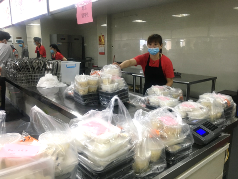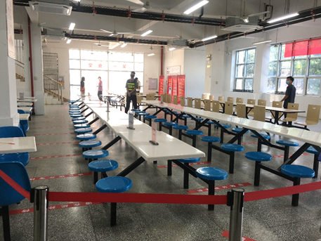 控制食堂人员流量。针对校区食堂就餐人员集中的情况,食堂采取有效措施进行管控。教职工暂不提供堂食服务,学生采取错峰堂食和网络订餐相结合的方式用餐。食堂就餐人员严格遵守出入分离、佩戴口罩、保持安全距离及斜位落座就餐等要求。