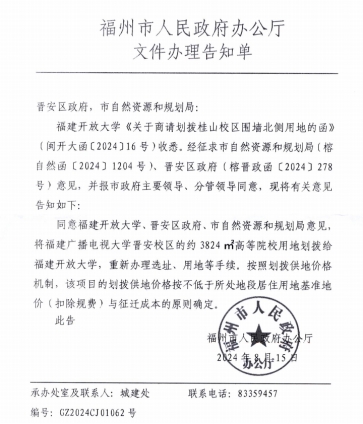 一是重点项目有所突破。积极与上级及业务主管部门沟通,推进桂山校区红线周边地块的土地事宜。经过努力,项目已获福州市人民政府批准,同意将桂山校区围墙北侧约3824㎡高等院校用地划拨我校。